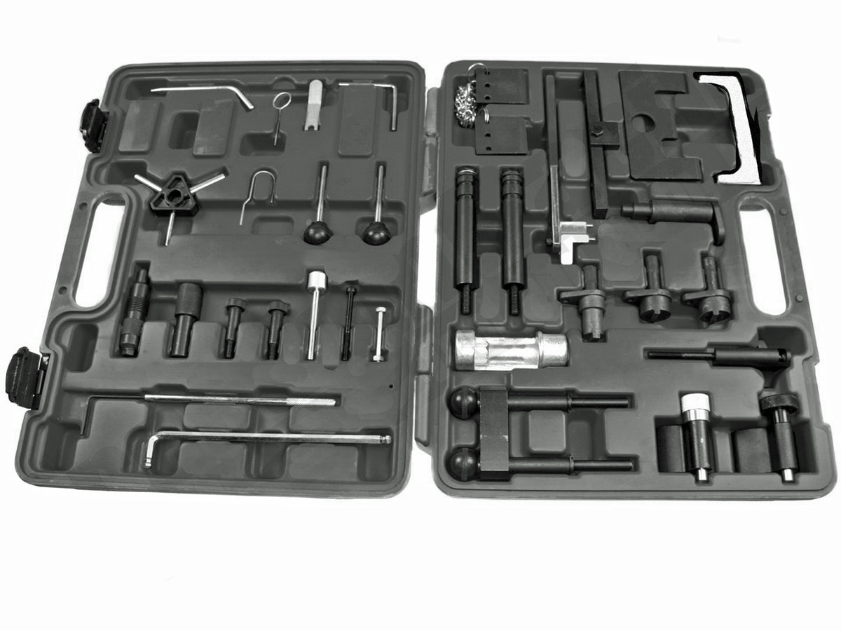 This master kit is designed for professional repair of VAG engines, facilitating the changing of the timing belt, crankshaft, and camshaft.
